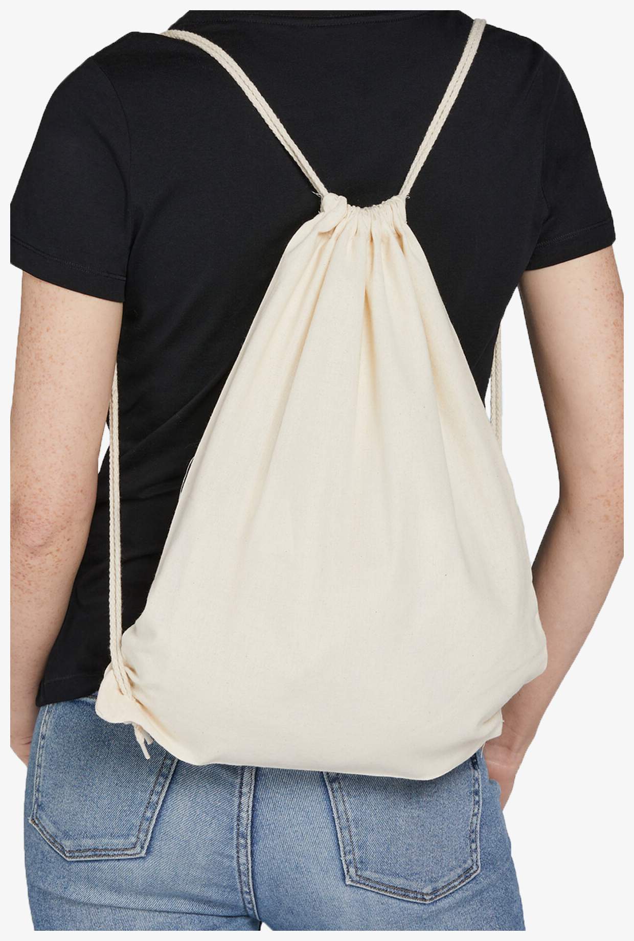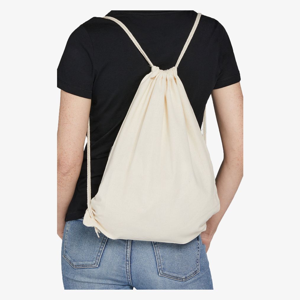 Gymväskan i bomull Organic Cotton Drawstring Backpack är gjord i 100% ekologisk bomull. Den mäter 38 x 48 cm och har en fåll med förstärkta öljetter. Axelremmarna fungerar som dragsko för att justera stängningen.