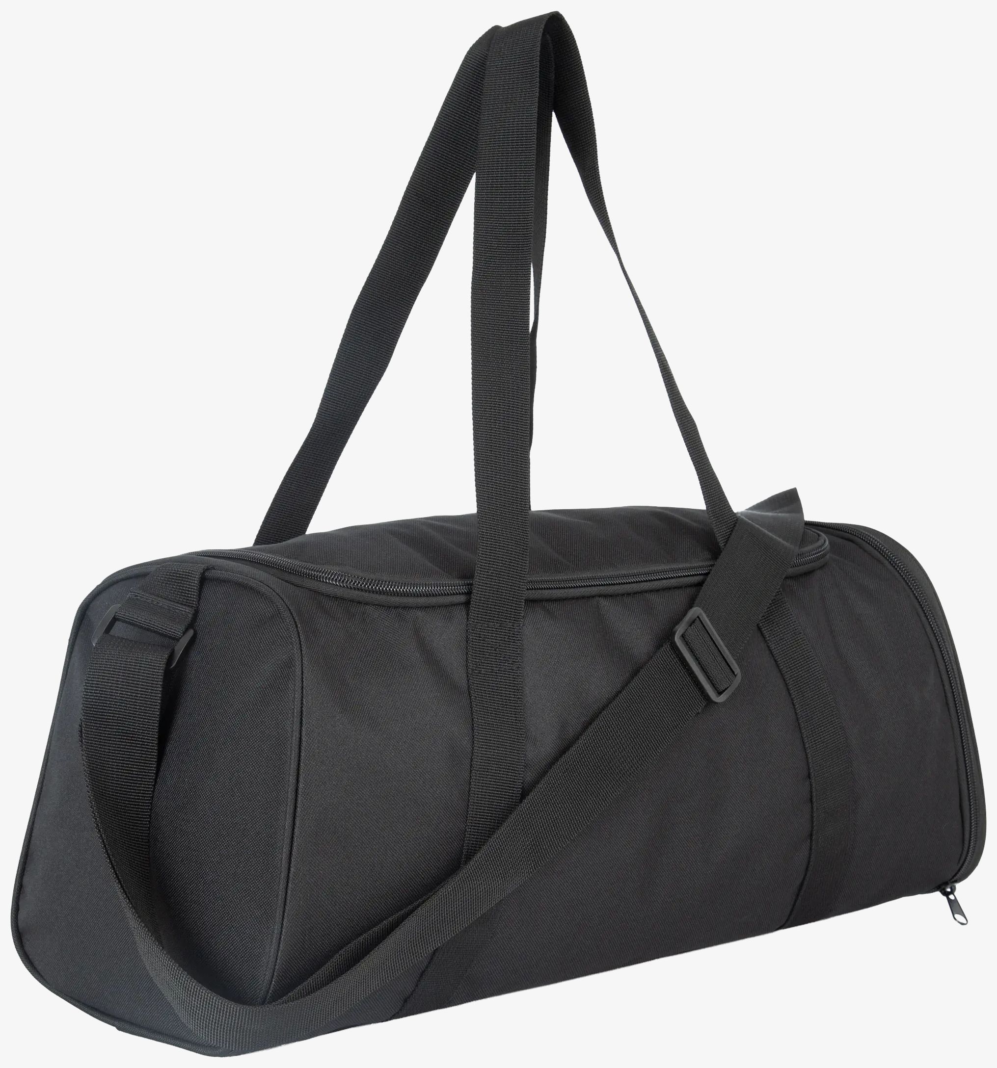 Sportväska med fack för skor är tillverkad i polyester. Den har en stor öppning upptill med dubbelriktad dragkedja samt en dragkedjeförsedd sidoficka med en inre skoväska. Handtagen i band är sydda på väskans kropp och en justerbar axelrem kompletterar funktionerna.
