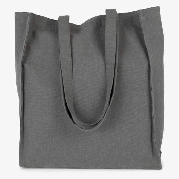 Den rektangulära shoppingväskan kombinerar huvudsakligen återvunnen bomull och polyester från återvunna PET-flaskor. Den har tyghandtag i samma material som väskan, med en kapacitet på 17 liter och måtten 35 cm x 12 cm x 40 cm.