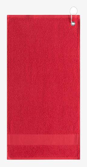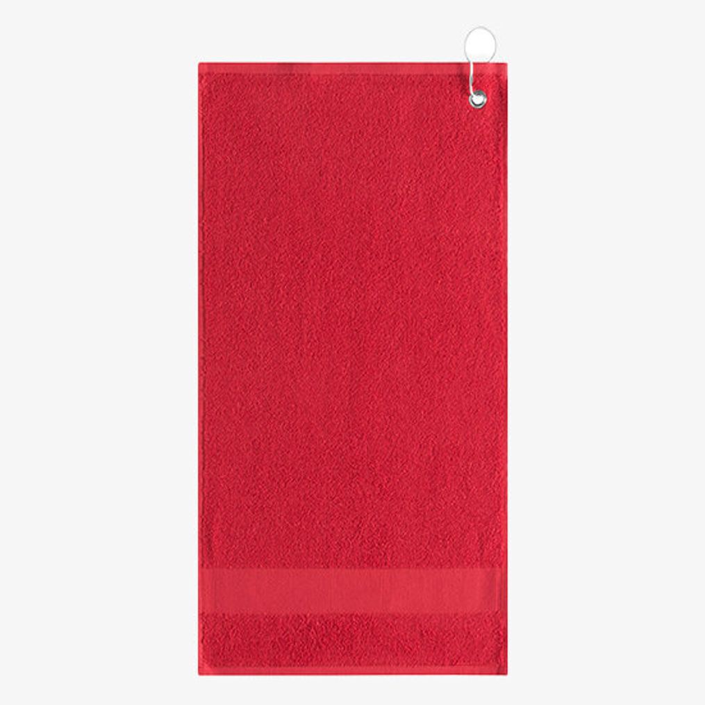 Golfhandduken med fäste kan enkelt hängas tack vare dess integrerade klämma. Den har en kant på 4,5 cm och måtten 55 x 30 cm. Dess sammansättning är 100% bomull.