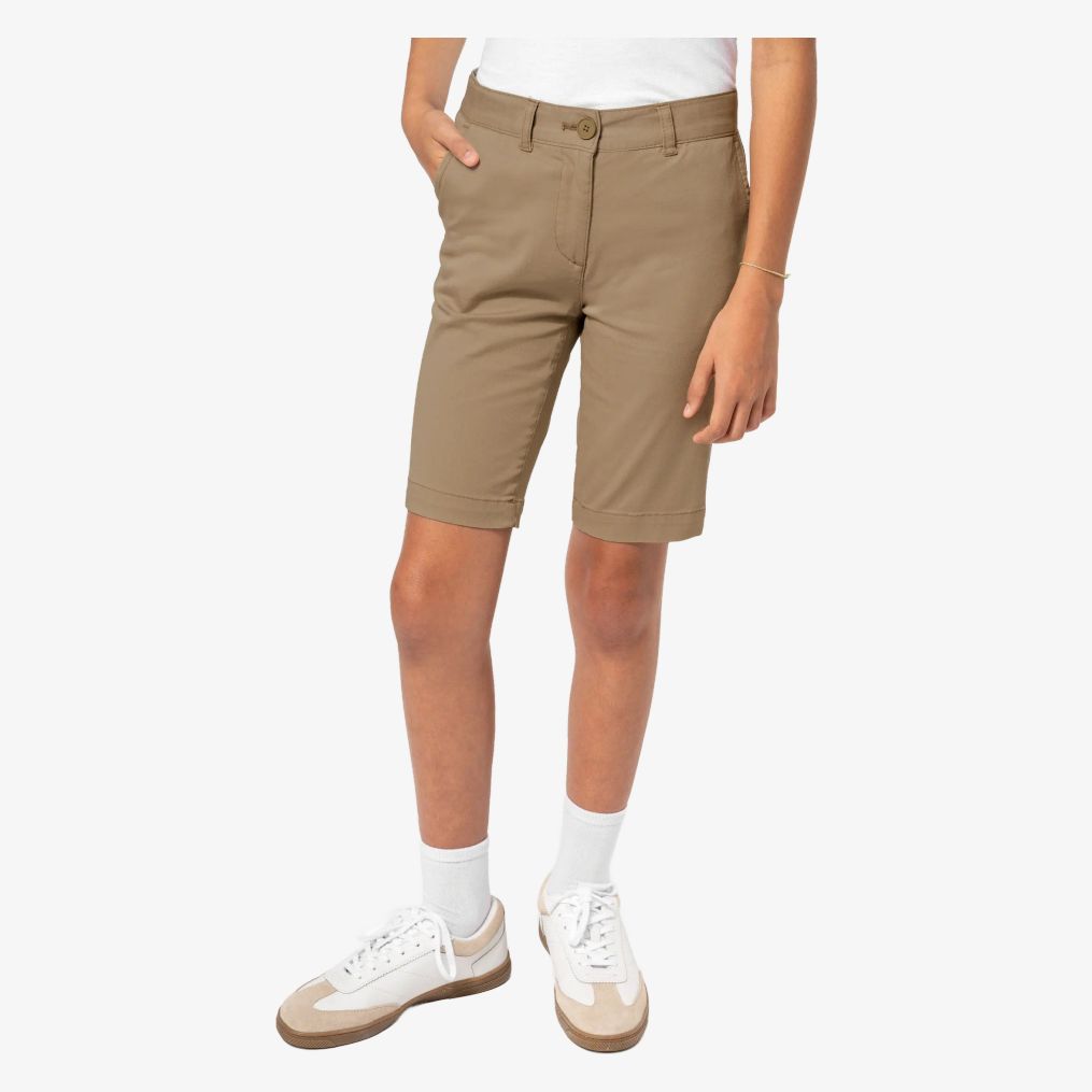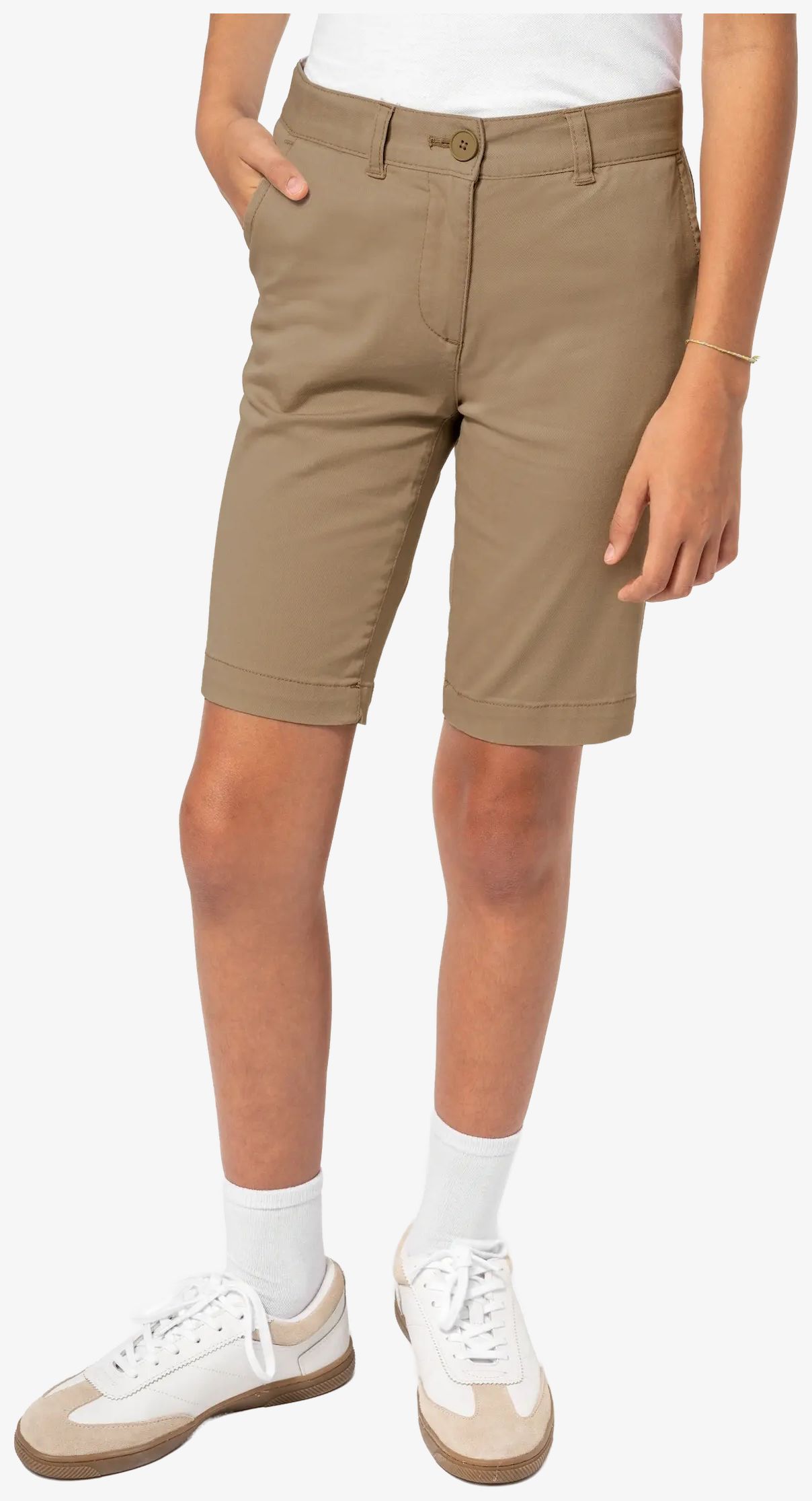 Den bermuda chino fille är tillverkad av 98% bomull och 2% elastan. Den har bälte med hällor och ett justerbart elastiskt innerbälte. Gylfen är försedd med metallknapp och dragkedja. Två framfickor med kantning och två paspoalfickor bak med stickning fullbordar modellen. Benavslutet är en enkel stickning.