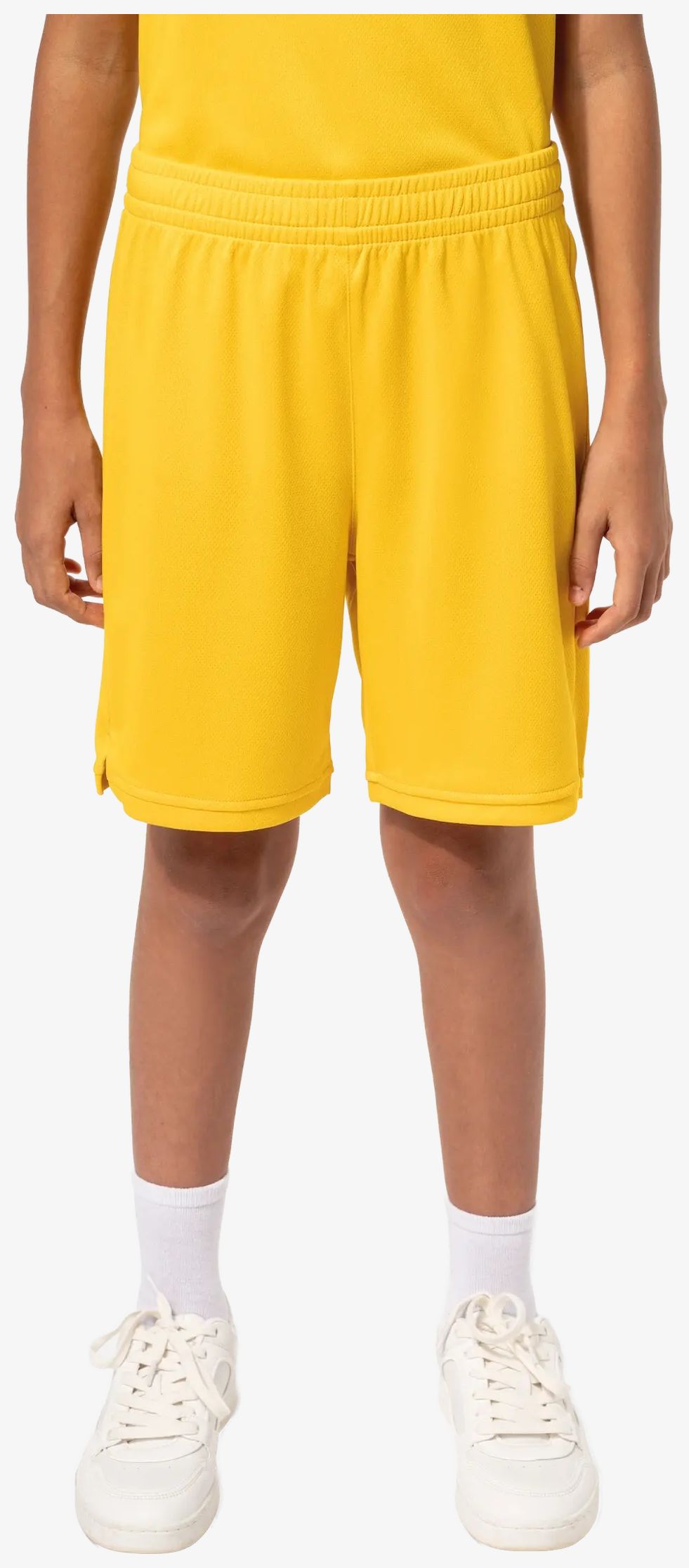 barn basket-short är tillverkad i mikroporerat polyester birdseye-tyg som ger bra andningsförmåga. Den har antistatisk behandling och ett elastiskt midjeband med flat dragsko för justering. Två öppna sidospjäll med ton-i-ton påsydda kanter underlättar rörlighet.