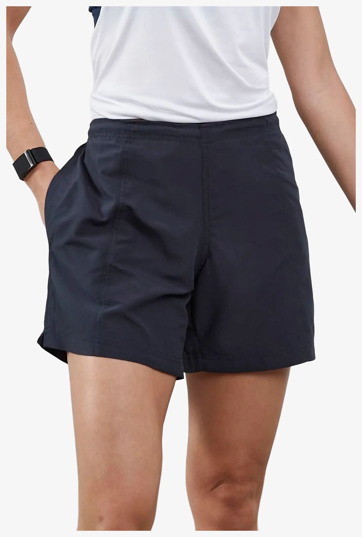 Dam-shorts i mikrofiberpolyester har elastisk midja på sidorna bak och platt fram med innerdragsko. Den har två sidofickor och en bakficka. Ej fodrad, ger en persikoliknande känsla.