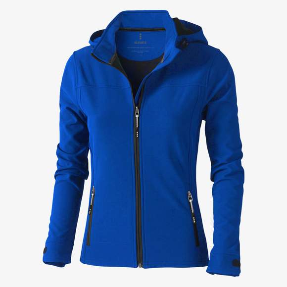 Dam softshelljacka med avtagbar huva med elastisk dragsko och omvänd dragkedja på framfickorna. Tyget är stretchigt och vattentätt.