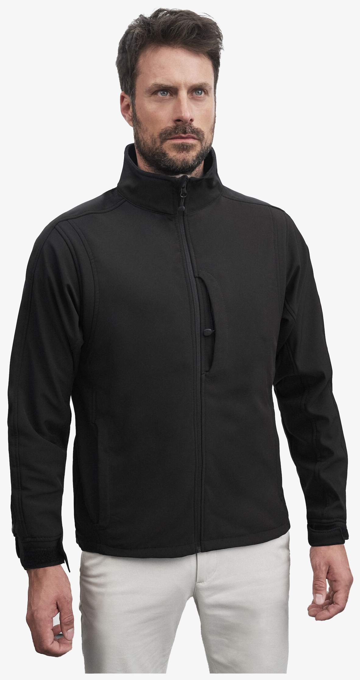 Softshelljackan för herr har ett yttermaterial av polyester och elastan, utformat för att vara vind- och vattentät samtidigt som det erbjuder viss andningsförmåga. Den har fleecefoder på ryggen och nätfoder fram samt flera dragkedjefickor för förvaring.