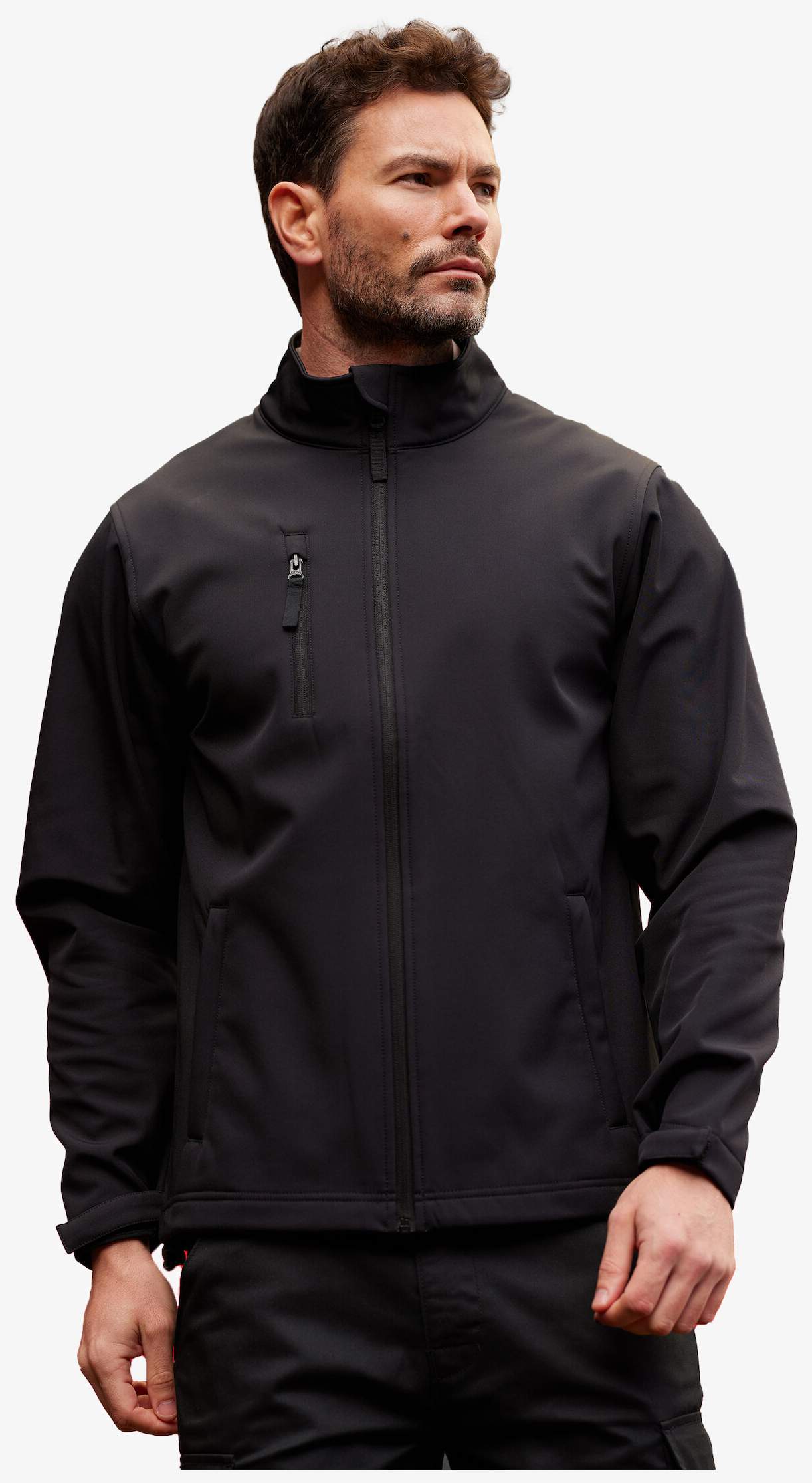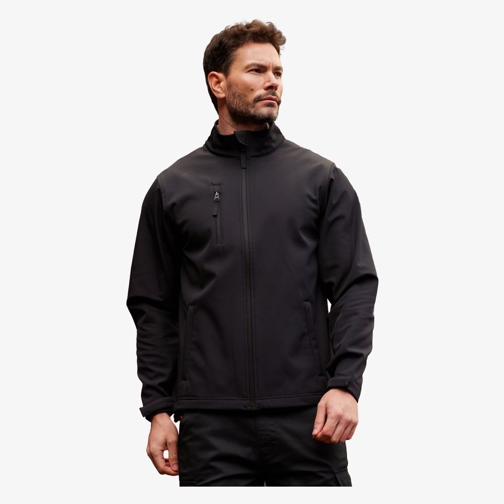Trelagers softshelljacka med normal passform och hel dragkedja framtill. Den har sidofickor och en bröstficka med dragkedja. Softshelltyget i tre lager är tryckbart. Den har hakskydd och en inner stormklaff. Fållen är utrustad med justerbara dragskor. Denna jacka skyddar mot vind och regnskurar.
