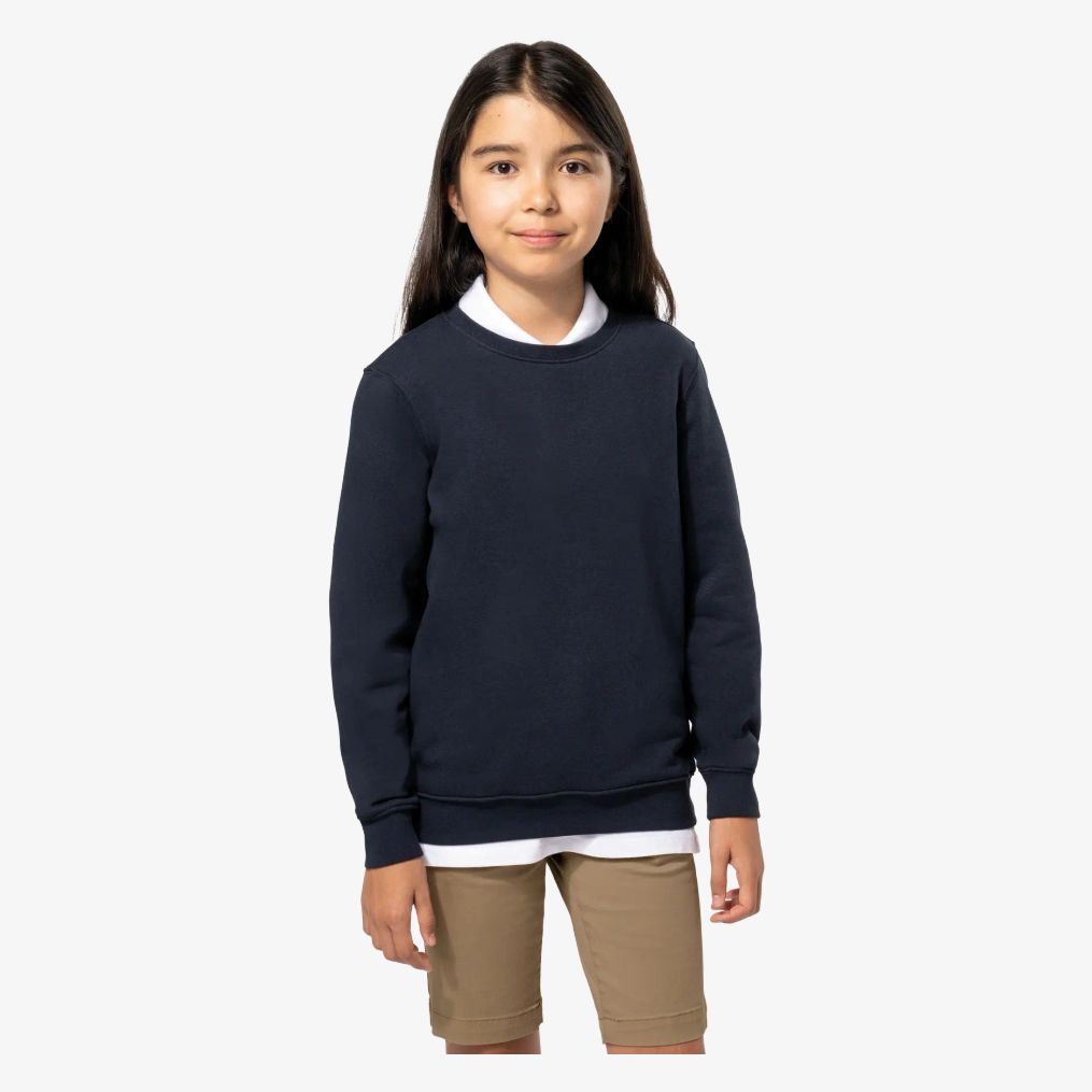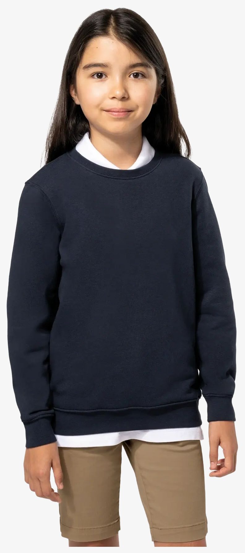 Barnets sweat-shirt med rund hals är tillverkad i 3-trådig borstad fleece med anti-pilling behandling. Den har figursydd passform med halsringning och ärmslut i 1x1 ribbstickning samt dubbel sydd finish på axlar, ärmhål och ärmslut. En ton-i-ton jersey kantband finns på insidan av halsen med en halvmåne bak.