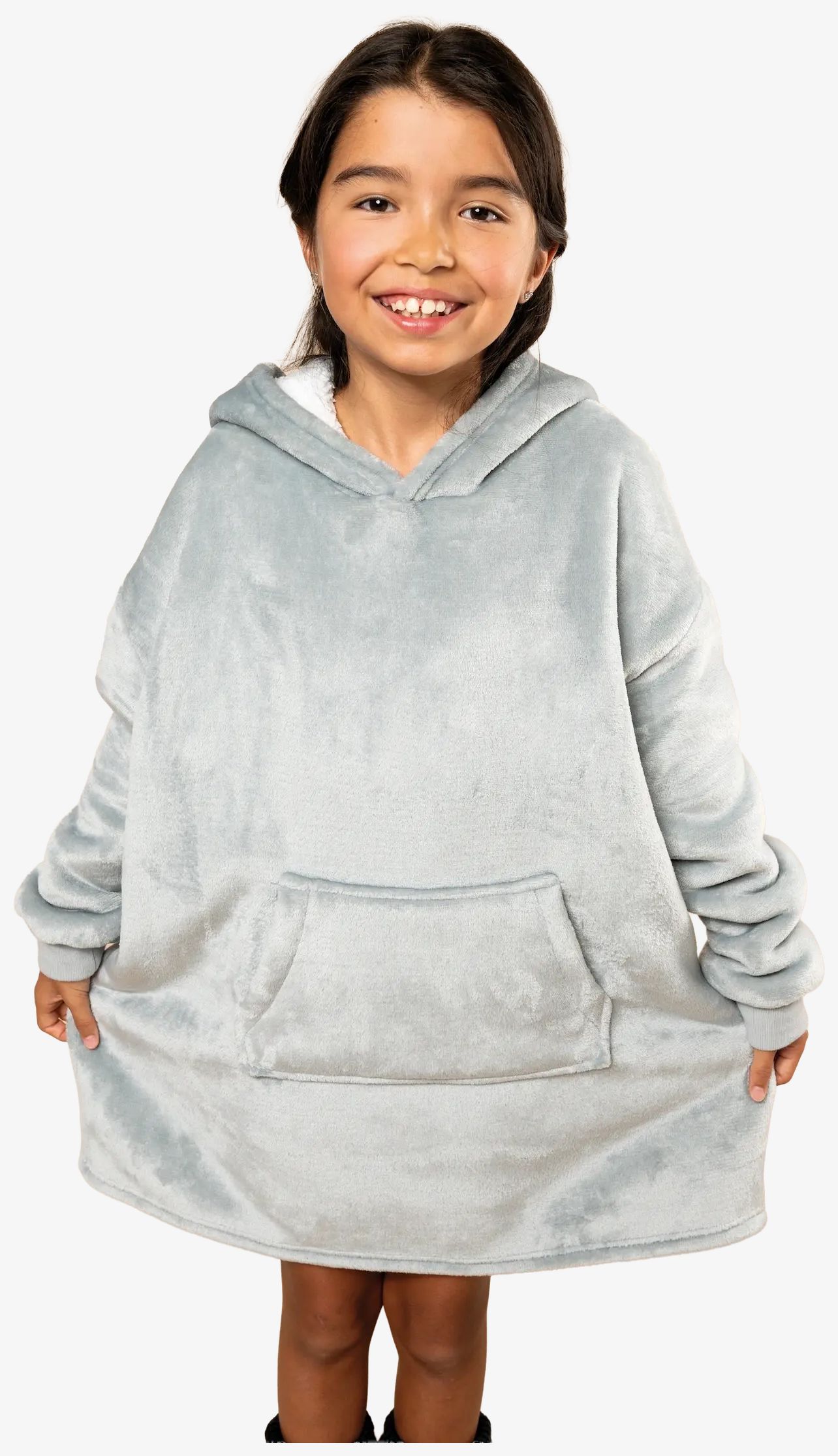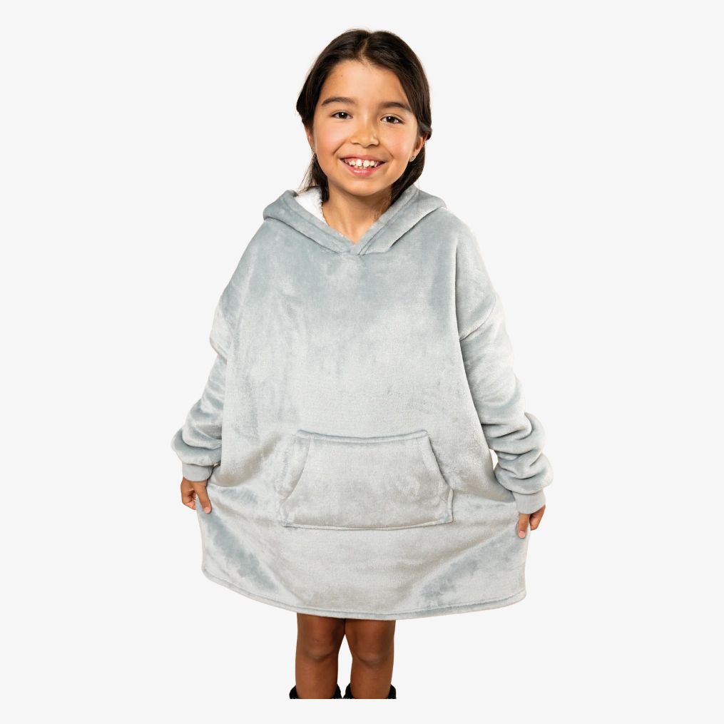 Barnets plaid poncho har en oversized passform med nedhasade axlar och ett dubbelvävt tyg med sammet på utsidan och sherpa på insidan. Den har en korsad huva framtill med två paneler och dubbla sömnadsdetaljer. De långa ärmarna har 1x1 ribbstickade muddar med elastan för att förhindra deformation. En känguruficka kompletterar modellen.