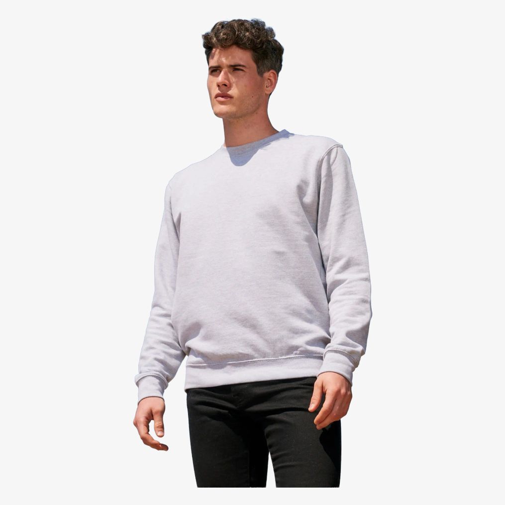 Den unisex rundhalsade sweatshirten har rakt snitt med påsydda ärmar och låg krage. Den är utrustad med 1x1 ribbade muddar och en innerklädd krage.