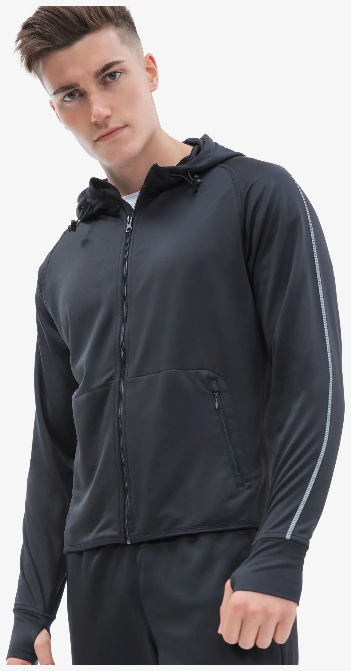Herrsporthoodie med figursydd passform, raglanärmar och blixtlåsfickor i sidan. Utrustad med innerficka för MP3 och tumhål vid muddar. Insidan är borstad för ökad komfort.