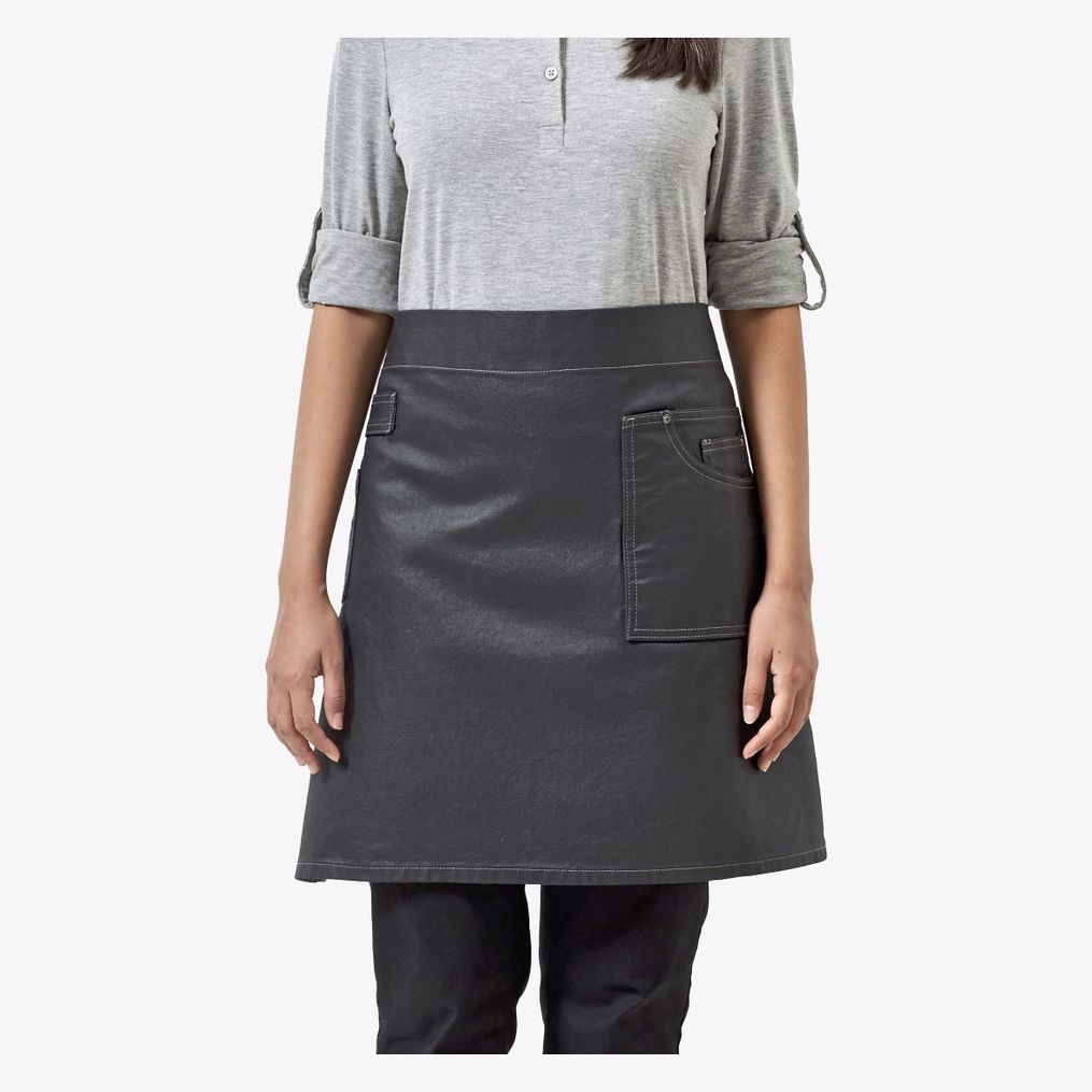 Midjelångt förkläde i bomull med vaxad effekt som ger ett robust utseende. Innehåller en påsydd ficka med stickningar och nitar, tillräckligt stor för en surfplatta. De kontrasterande snörena är fastsatta med metallöljetter.