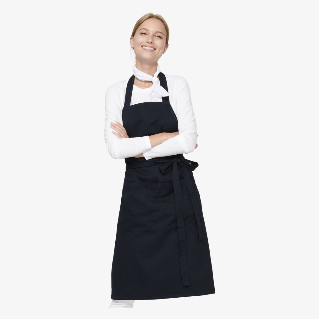 Den långa förklädet av bomull från ekologiskt jordbruk har en stor framficka delad i två fack. Den är justerbar vid halsringningen med en knapphålsöppning.