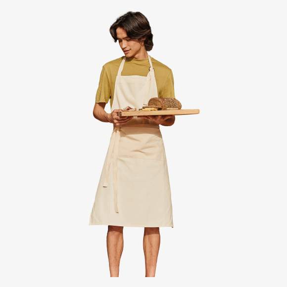 Det hantverksmässiga förklädet i bomullsserge har ett komplett bröststycke med en djup framficka för förvaring. Fästen vid nacke och midja är i bomull med fiskbensmönster, den skjutbara spännet ger noggrann justering. Mått 70 x 93 cm.