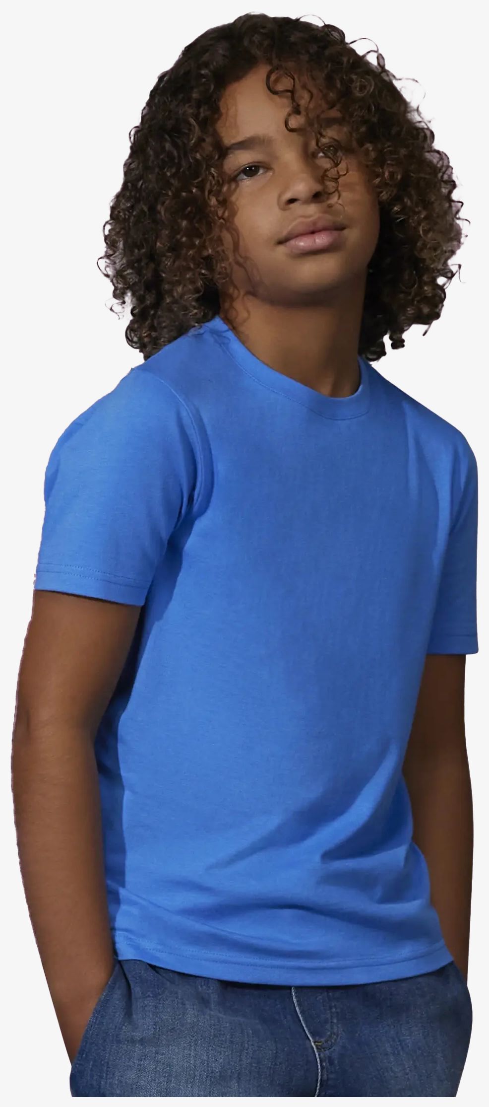 Kids #E150 tee-shirt i ring-spun bomull är tillverkad i enkel jersey med tubformad konstruktion utom för storlek 1-2 år som har sidostygn. Den har en smal halsringning och ett förstärkt halsband. Hela plagget är utan etikett.