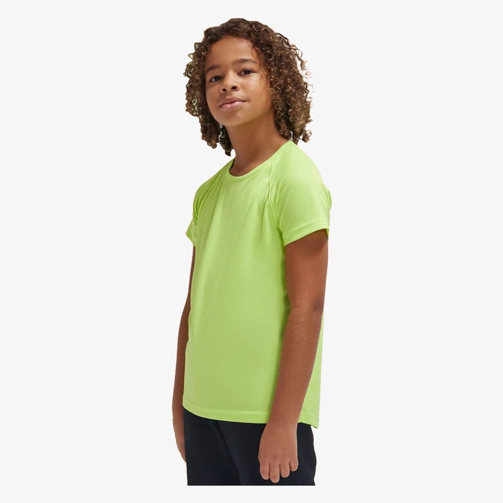 Kids Active T är en nätmönstrad tee-shirt designad för att främja andningsförmåga och fuktevakuering. Den har raglanärmar och sidoseam med en etikettfri konstruktion. Tyget är återvunnen polyester med snabb torkning.
