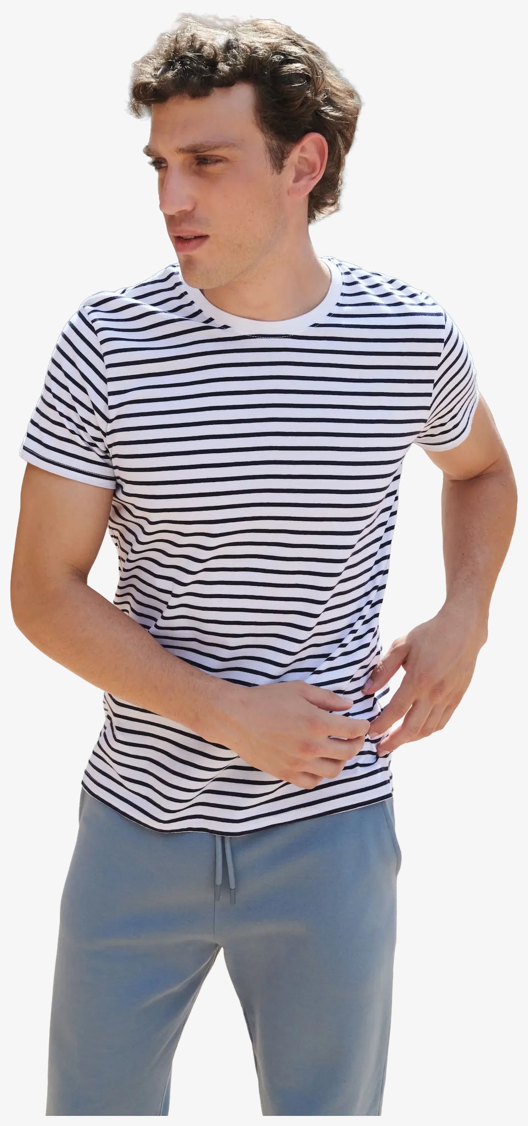 Den randiga unisex bomulls-tee-shirten är konstruerad med en avtagbar etikett och en Stretch®-krage. Kompositionen är 100% bomull utom för färgen heather grey/white som är 85% bomull och 15% viskos.