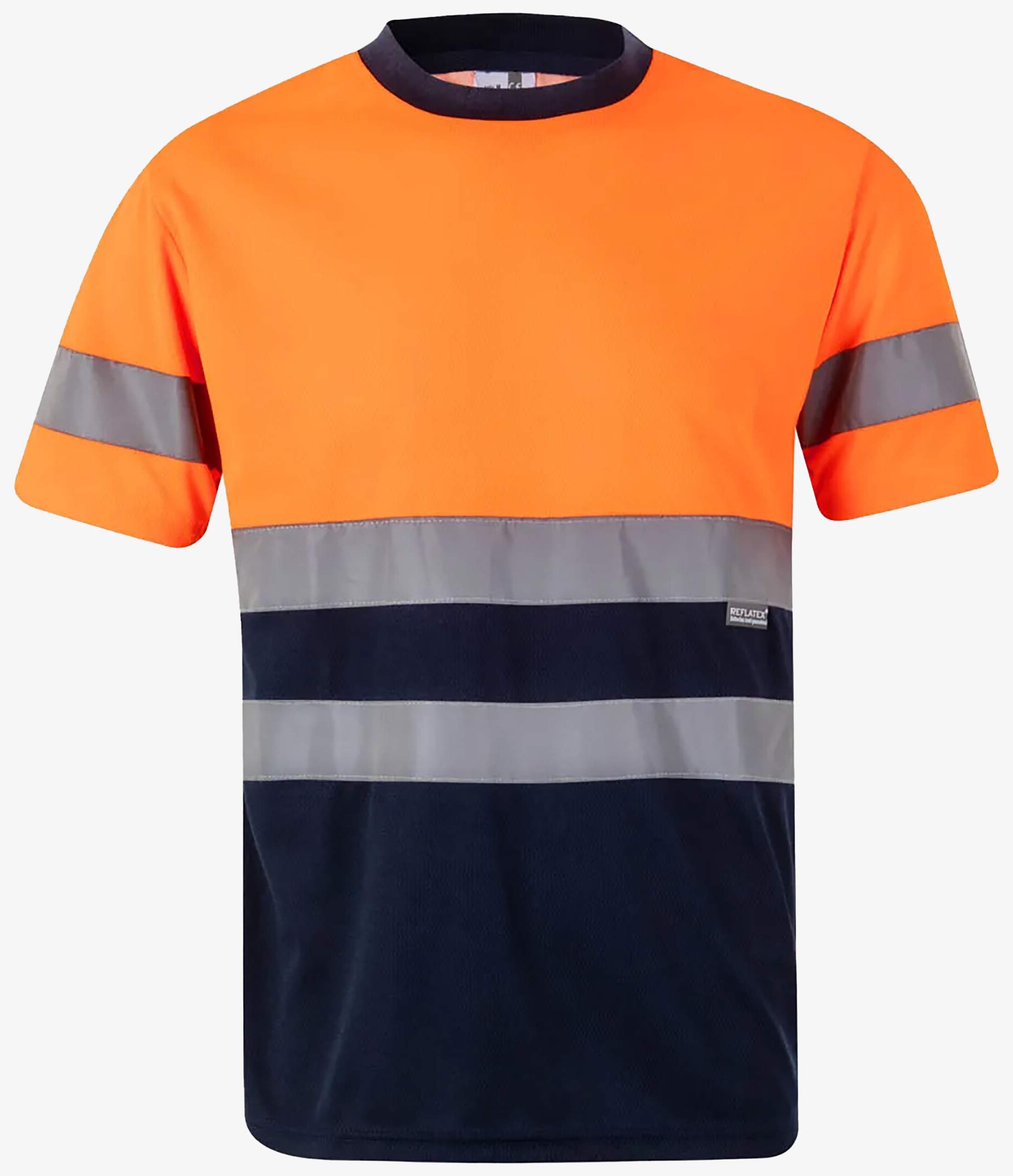 Synlighets tee-shirt har rund hals med kontrasterande resårkanter och reflexband på bröstet och ärmarna. Tillverkad i polyester, avsedd för användningar där synlighet krävs.
