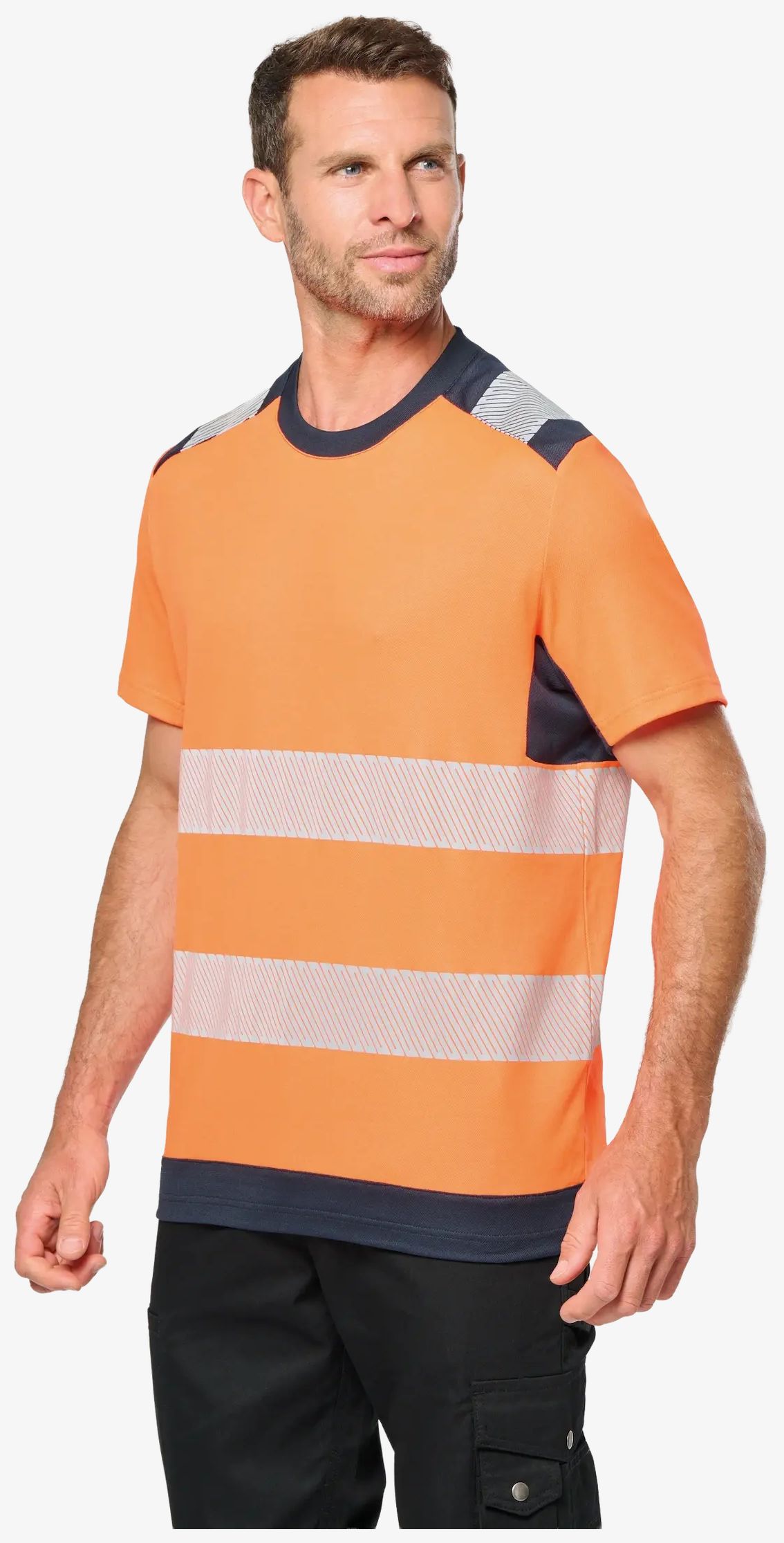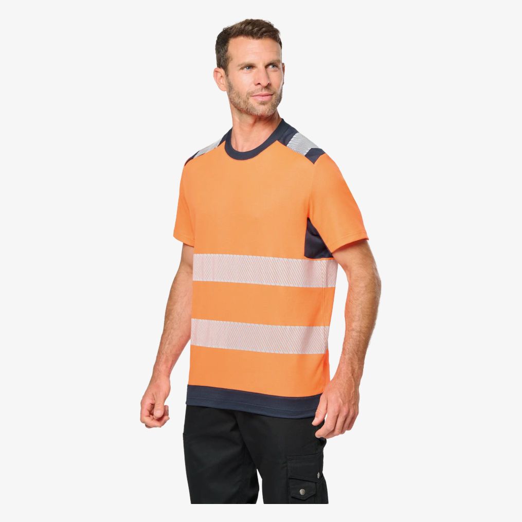 Den återvunna säkerhets-tee-shirten med korta ärmar unisex är tillverkad med övervägande bomull och återvunnen polyester. Den innehåller termolaminerade reflexband i segment för att förbättra synligheten utan stelhet. Piquetvinyl och antipillingbehandling bidrar till komfort. Rak passform ger en klassisk silhuett.