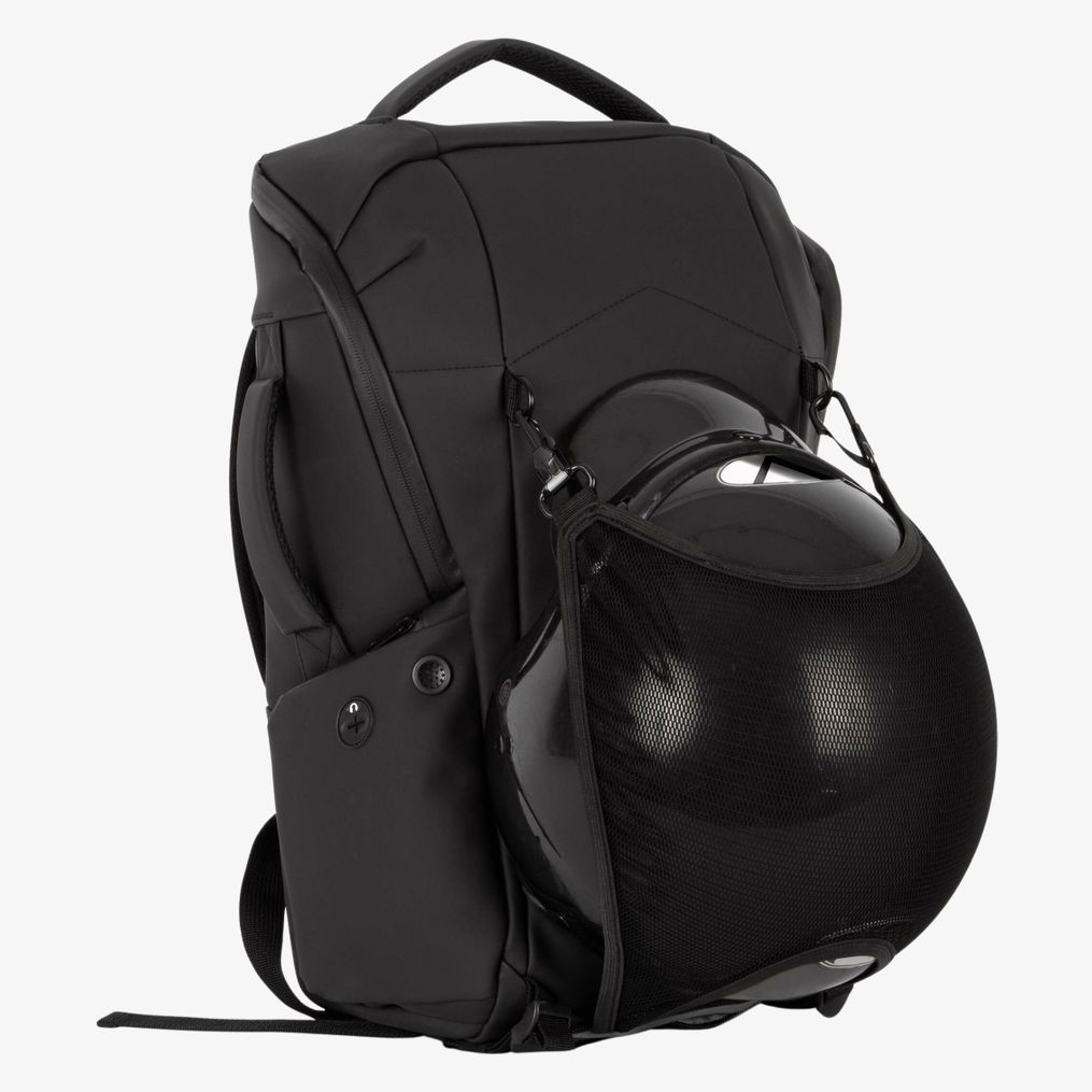Vattentät antiväskryckningsväska med hjälmfäste har ett avtagbart elastiskt nät som passar cykelhjälmar, elsparkcyklar och scooters utan integrerad hjälm. Den har TSA-lås med kombination, en sidoficka med inbyggt låskabel och RFID-skydd mot bedräglig kortavläsning. Väskan innehåller flera blixtlåsfickor, en USB-port med micro USB-kabel, ett vadderat fack för dator upp till 15" och surfplatta upp till 11".
