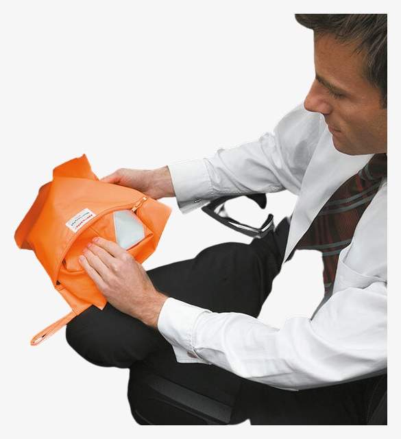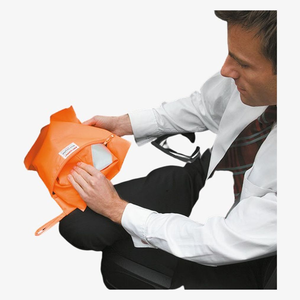 Pocket for Safety Vests Fodralväska r213 är en tom väska i polyester, avsedd för prydlig förvaring av en säkerhetsväst. Transparent plastframsida, dragkedja på baksidan och handledsrem för grepp.